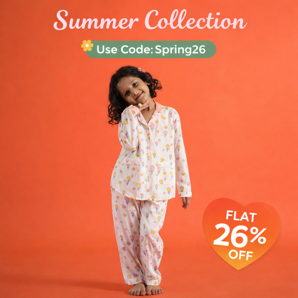 Organic Cotton Night Suit - Butterfly and Flower Design Hand Block Printed for Girls